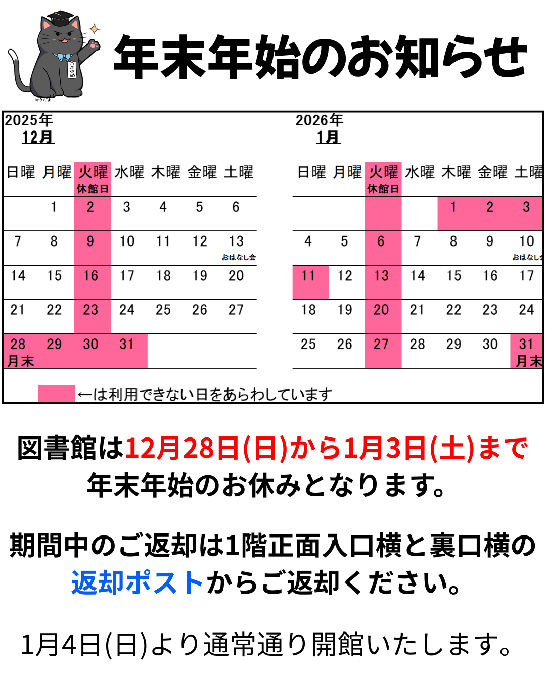 期間中は貸出・窓口での業務・新聞の閲覧、電話対応などはできませんのでご了承ください。