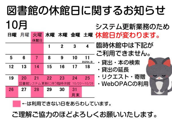 伊予市立図書館は、10月20日(月)から10月26日(日)までシステム更新のため休館いたします。 期間中は全てのサービスがご利用いただけません。 ご理解とご協力をよろしくお願いいたします。