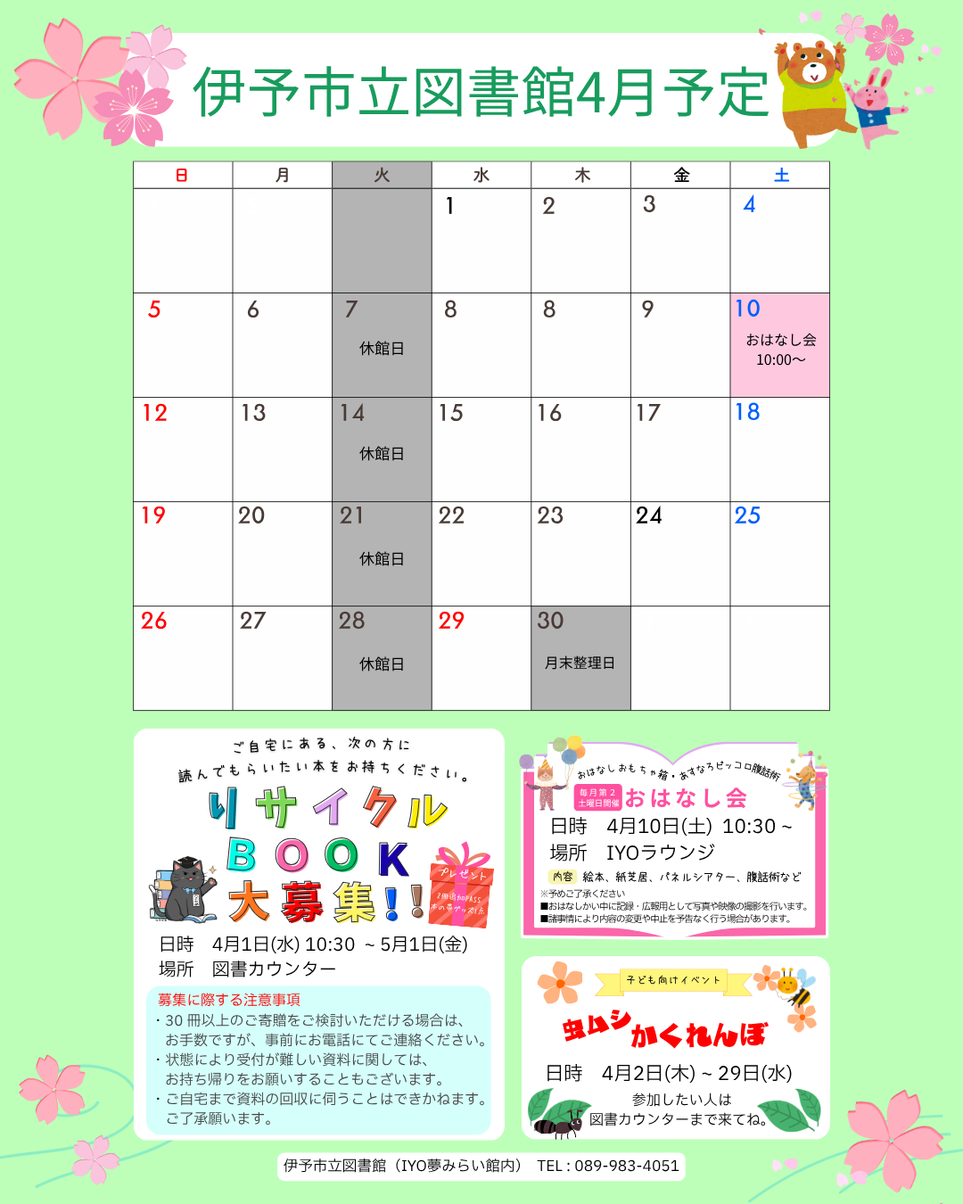 伊予市立図書館より4月に開催される展示やイベントのお知らせです。