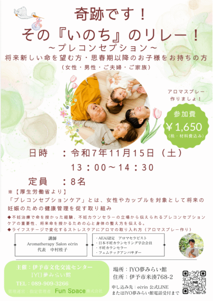 また、『妊活』の上手なストレスケアの提案として、アロマスプレー作りを体験して頂きます。